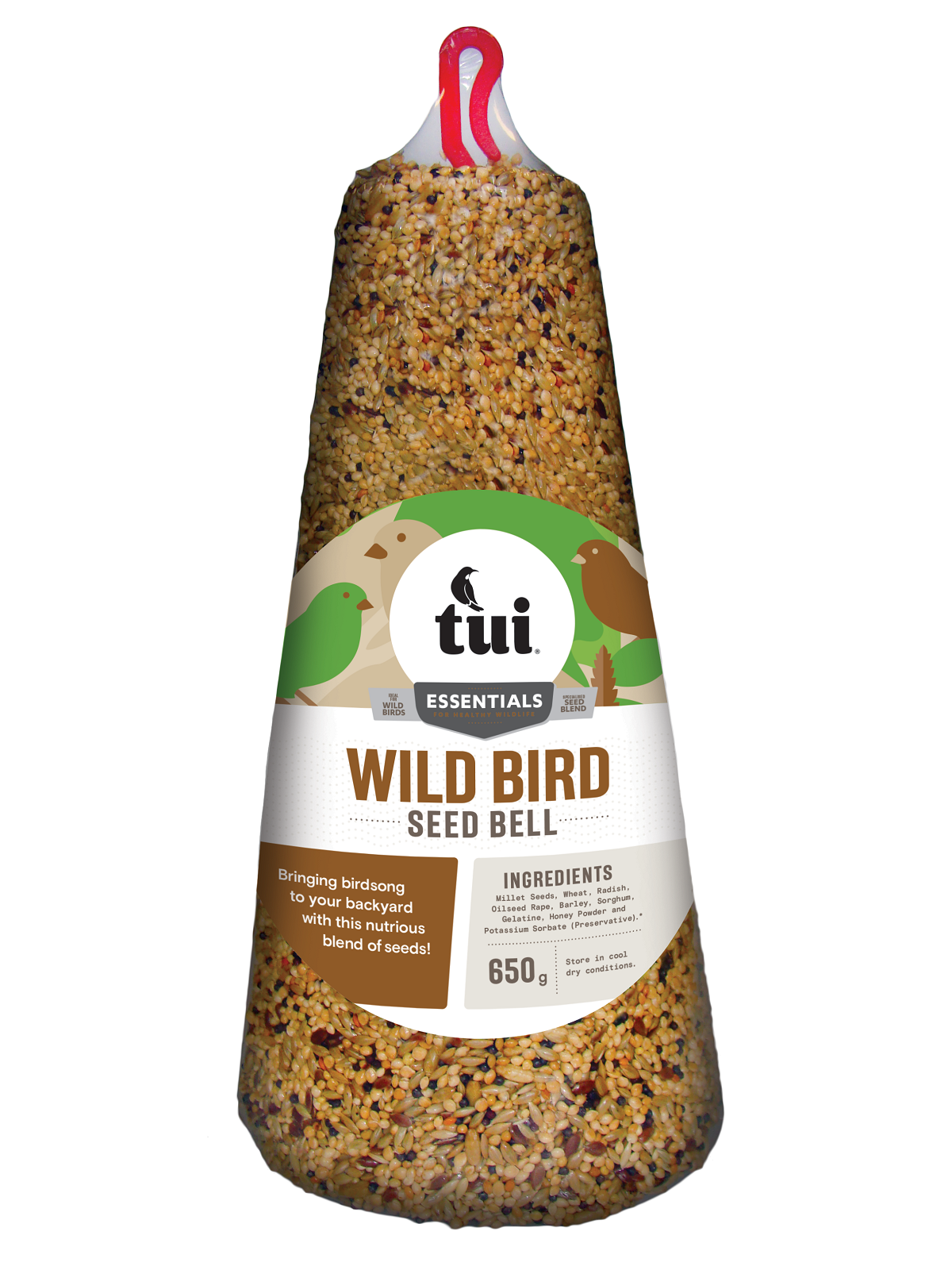 Tui's Wild Bird Seed Bell will give birds days of entertainment and nutrition as they use their natural pecking instincts to pull apart the bell. The bell is a mixture of Wild Bird Seed Mix plus gelatine and honey powder to form a bell that birds love to peck at and eat.