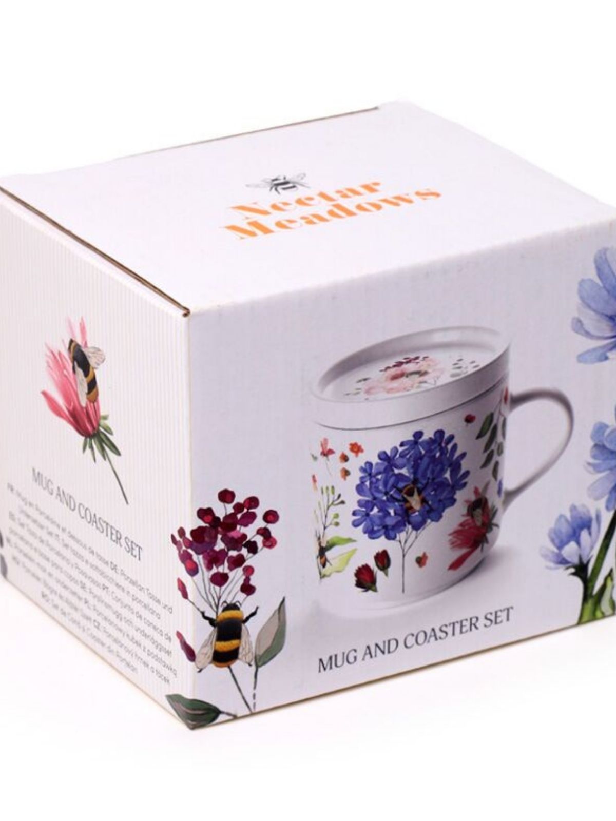 Enjoy your favourite hot drink in style with this beautiful Nectar Meadows Ceramic Mug & Coaster Set. Decorated with vibrant floral artwork and charming bees, this set brings a touch of nature-inspired elegance to your morning routine. The mug features a comfortable handle and generous size, while the matching coaster doubles as a lid to help keep your drink warm and protect your surfaces.