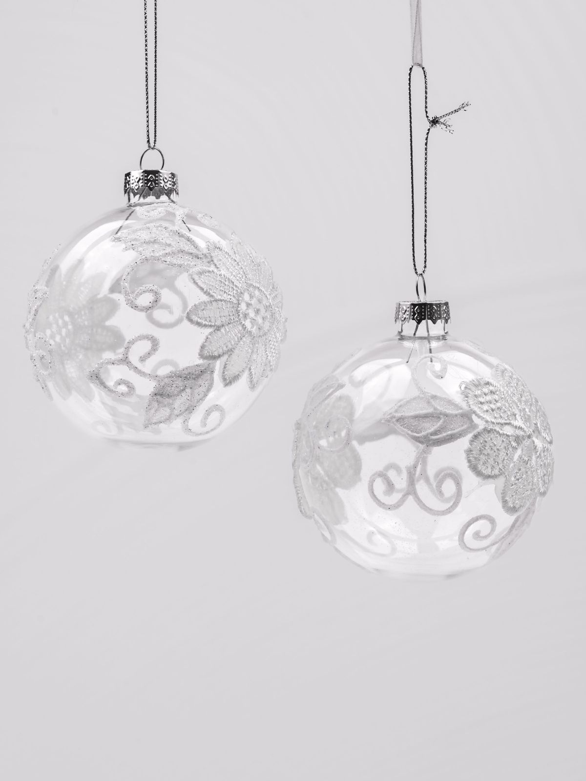 Add timeless elegance to your Christmas tree with this beautiful, clear glass bauble, featuring a delicate lace-inspired finish. The intricate white detailing creates a soft, frosted look that captures the light beautifully, bringing a touch of refinement to any festive display.
