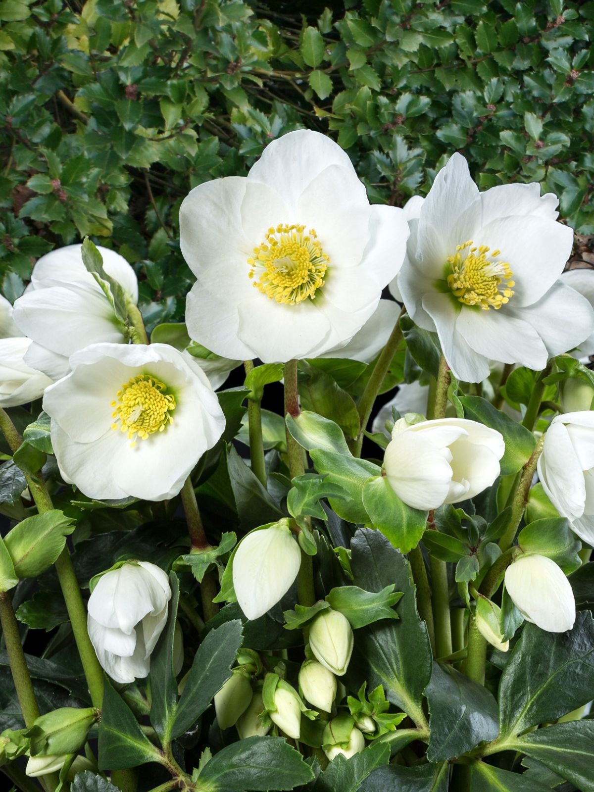 The Helleborus Jacob 2.5L is a striking perennial, showcasing large, crisp white flowers with a soft yellow center, perched on strong reddish stems above glossy deep green foliage. Perfect for adding year-round interest, this hardy Jacob variety thrives in full sun or part shade and prefers well-drained soil. Ideal for pots, planters, and garden borders, it grows to a height of 40-45cm, making it a versatile addition to any garden landscape.