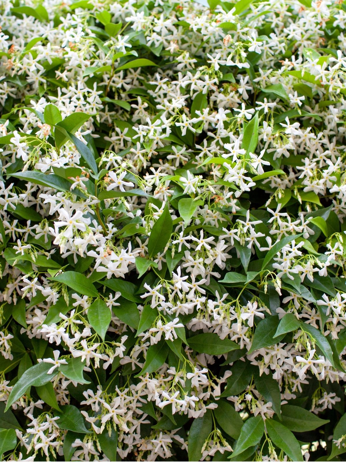 Trachelospermum jasminoides, commonly known as Star Jasmine, is a climbing vine native to East Asia. It is known for its highly fragrant, star-shaped white flowers that bloom in early summer. The leaves are glossy and evergreen, making it an attractive plant for year-round gardening. Star Jasmine is often used as a climbing plant on walls, fences, and trellises, or trained to grow over arbors and pergolas. It is a hardy plant that is easy to grow and maintain.