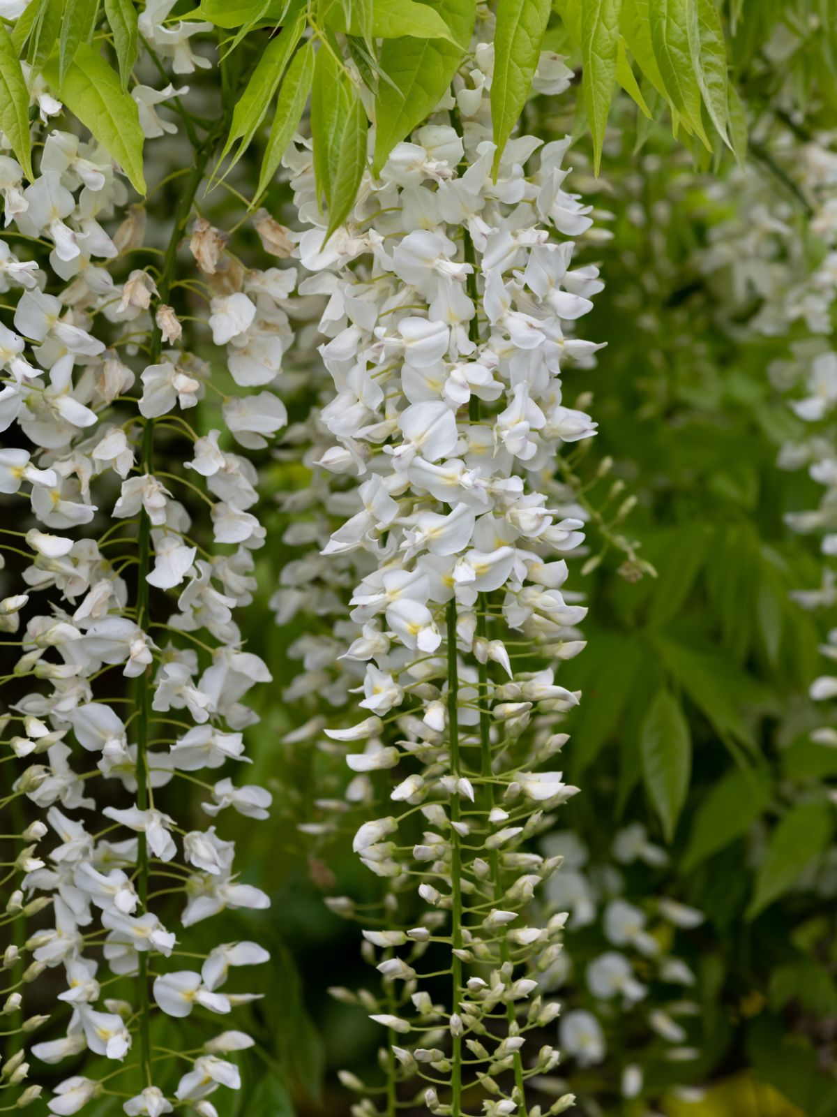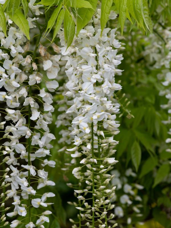 Elevate your garden with Wisteria Floribunda Snow Showers, this captivating climber boasts lime-green foliage that transforms into a lush dark green backdrop for its fragrant, pure white flowers. From late spring into summer, it graces your outdoor space with densely packed racemes of white blossoms adorned with a delicate yellow blotch, offering both visual appeal and a faint, delightful scent. To maintain its lush appearance and abundant blooms, prune after flowering and again in winter as needed. Whether you seek a garden masterpiece or a serene sanctuary, this plant is your go-to choice for beauty and resilience.
