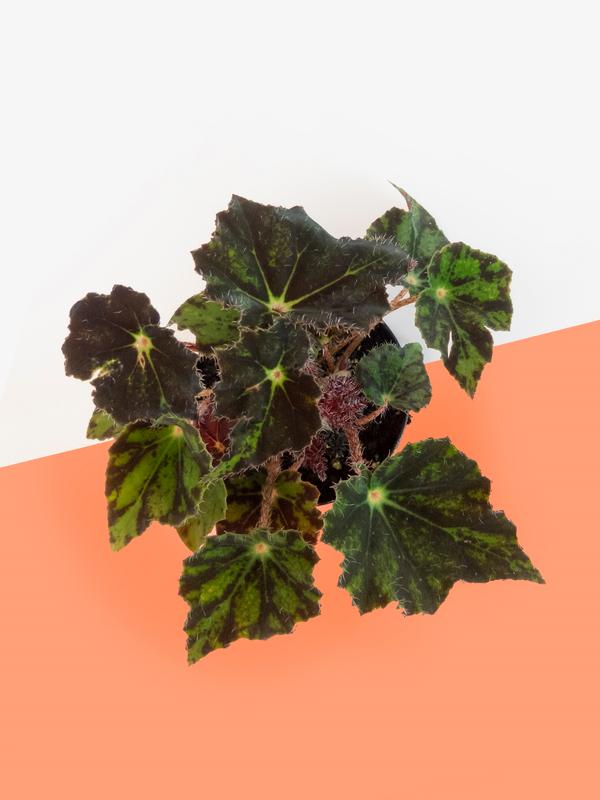 An interesting begonia with bold, green and dark purple foliage with pointed edges edges. The patterns vary on each textured leaf.