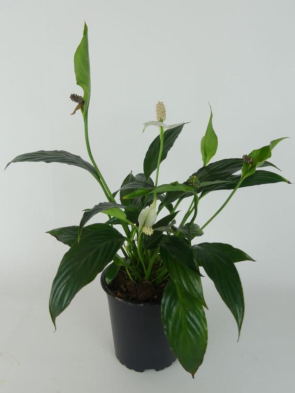 Elegant, indoor flowering plant with attractive dark-green pointed leaves and creamy white flower spikes.