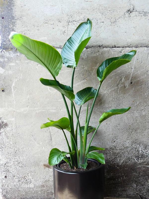 The very popular birds of paradise houseplant. It is an evergreen perennial with large paddle shaped leaves, and can grow to very tall. a lovely tropical looking houseplant.