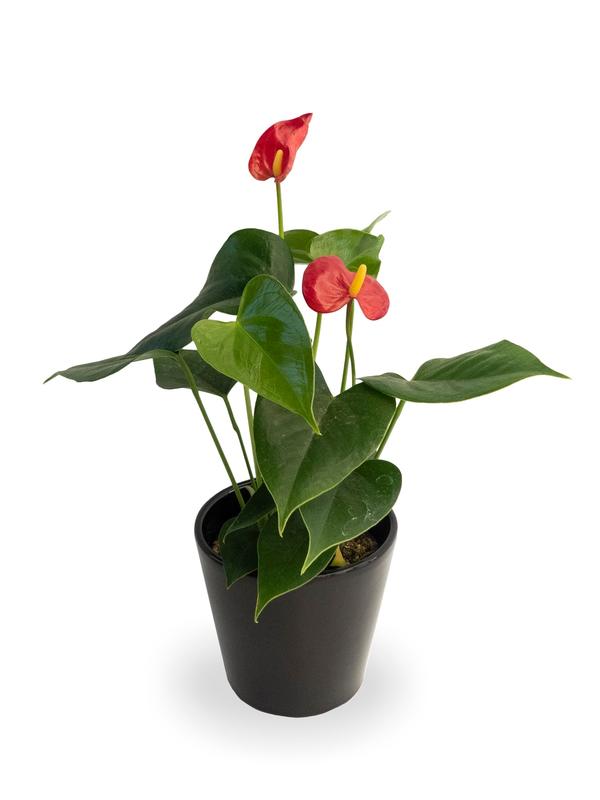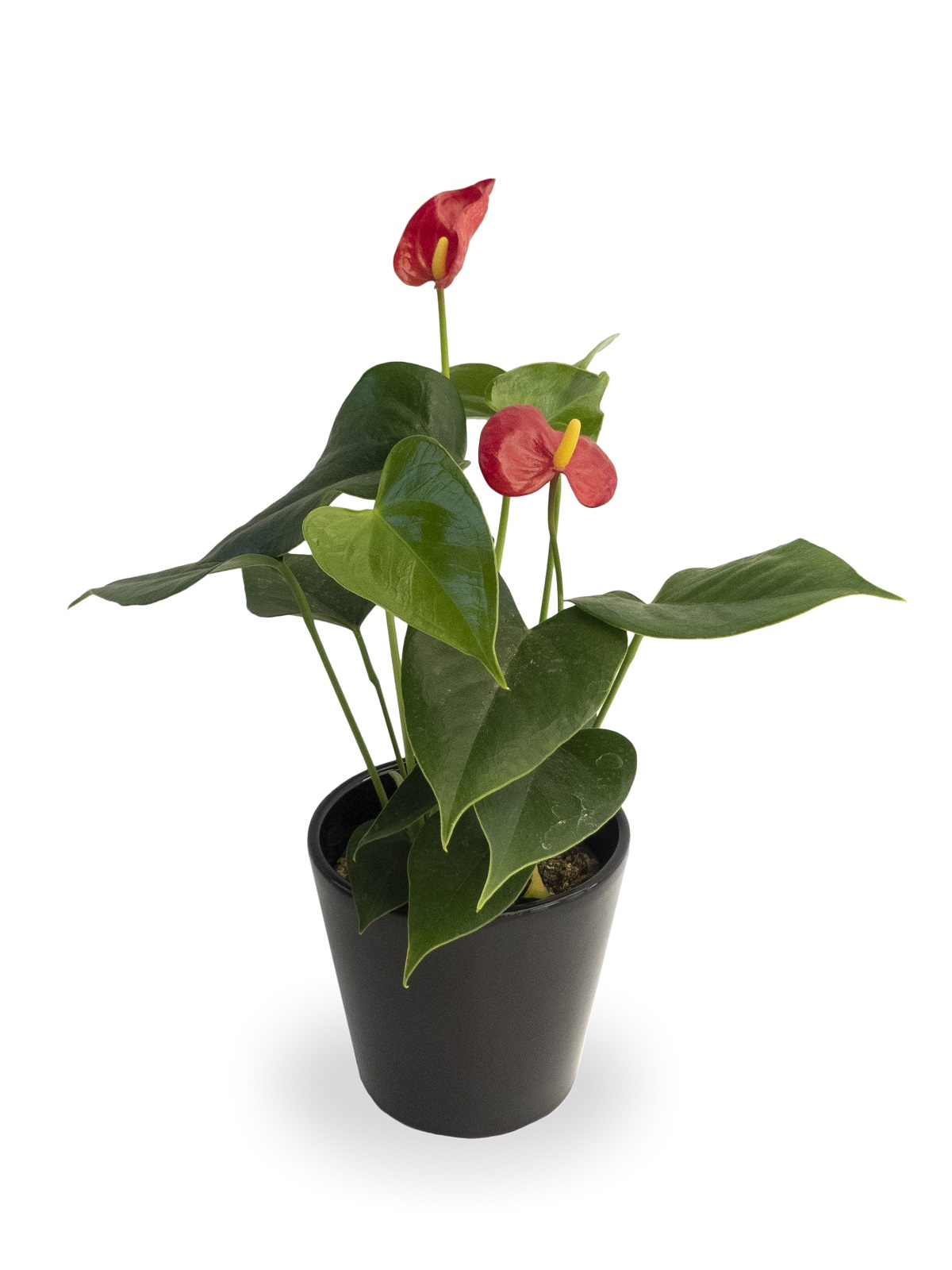 Mini Anthurium Arrow 12cm. With beautiful long-lasting flowers shiny red flowers and flat glossy green leave this plant will be a spectacular feature in your home adding a tropical vibe. The beauty of this Anthurium is that as one flower dies another appears.