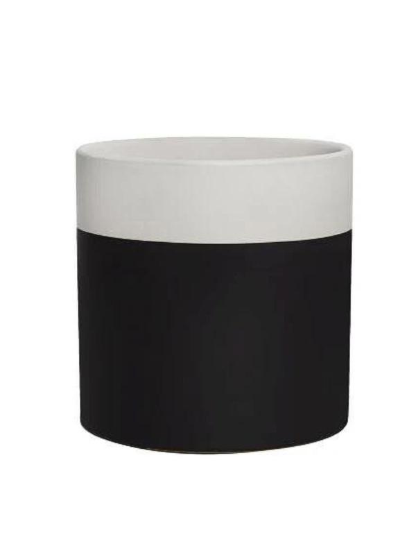 This elegant cover pot features a minimalist design with a matte finish in black and ivory tones, and it is glazed both inside and out.