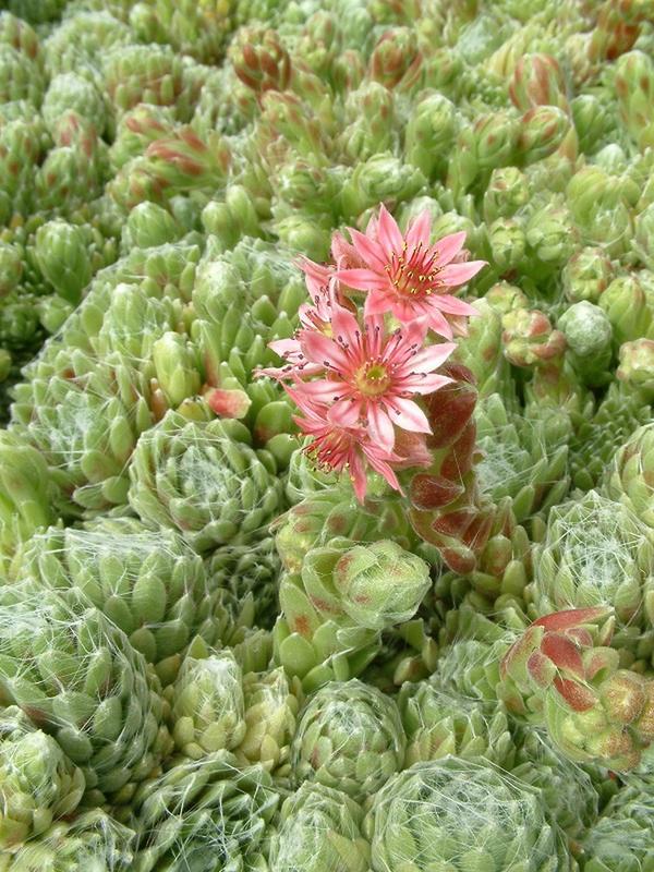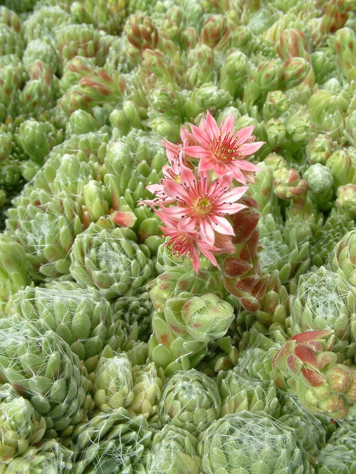 These plants grow in a circle around each other creating a carpet effect. They have medium sized pointy rosettes, bright green in colour, with pastel flowers appearing in summer. The name comes from the web looking coating that strings between the leaf points. Can grow to a height of 15cm-20cm with the same spread.