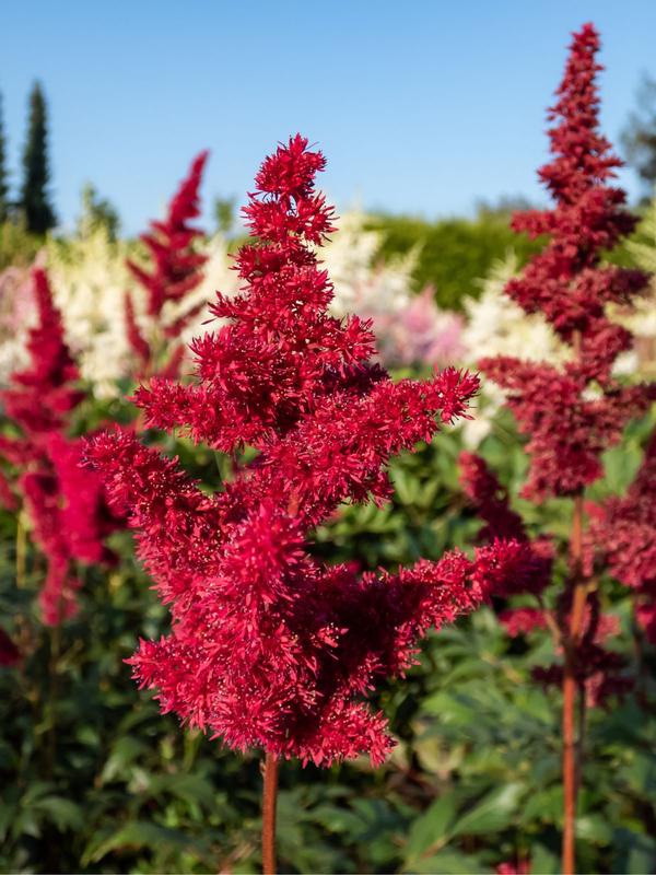 For maintenance, prune back any dead foliage in late autumn or early spring, and ensure regular watering during dry periods. Dividing the plants every 3-4 years helps maintain their health. Astilbe 'Fanal' is low-maintenance, making it an ideal choice for various garden styles, including mixed borders, shady gardens, and even as cut flowers.