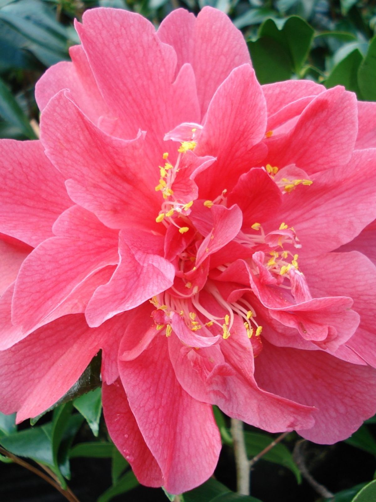 Compact evergreen shrub with glossy foliage and red, semi-double blooms. Upright growth habit makes it ideal for hedging, screening, or as a feature plant.