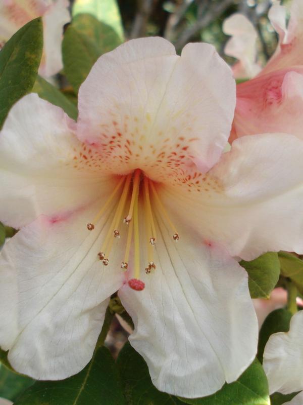 Rhododendron Ostbo Low Yellow features charming funnel-shaped flowers in cream, yellow, and apricot hues, accented by a vibrant apricot orange center. Delicately held in loose trusses, these blooms emerge from pink buds. This variety is exceptionally cold hardy and typically grows to a height of 1.2 meters, flowering in November.