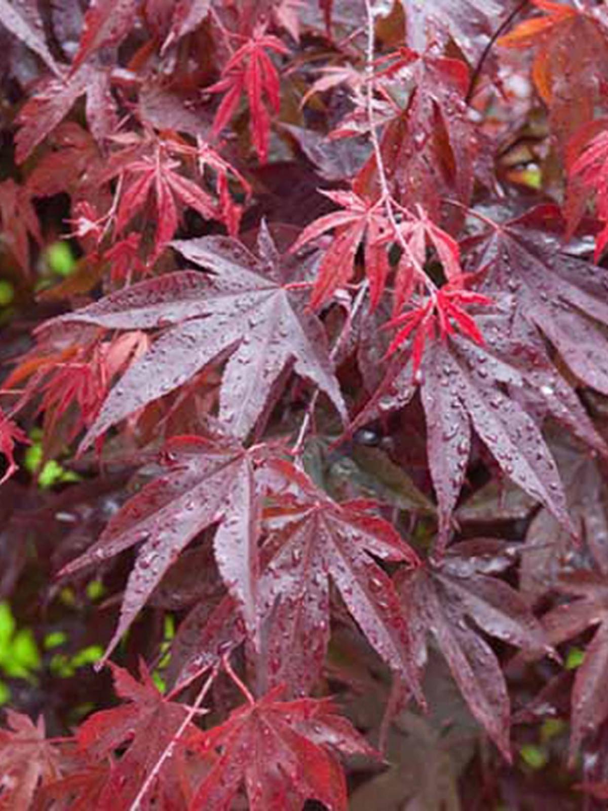 The 'Bloodgood' cultivar of Japanese maple is an ideal tree for smaller yards. Most people use them as specimen trees, although they are also used in bonsai. They bloom in spring, and this is when the red in their foliage is often at its brightest. The colour darkens in summer to burgundy, or even darker. Although the leaves can become even showier in autumn than in summer, the foliage is attractive for a full three seasons of the year. This common tree may reach a height of 5+ meters (with a similar spread) at maturity but is a slow grower.