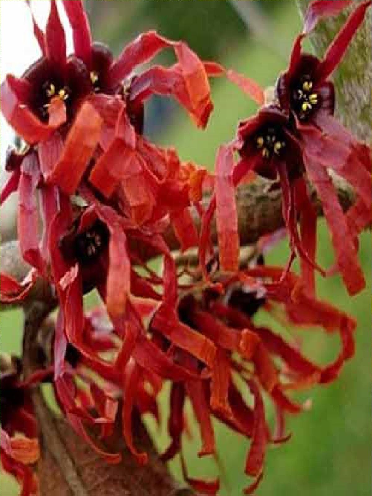 An interesting neat, upright, shrub that produces fragrant red blooms in late winter. The flowers are characterized by their shaggy spider like form.