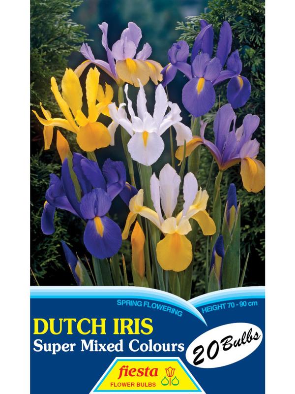 Dutch Iris Fiesta Super Mixed, are hardy fun-to-grow bulbs that produce excellent flowers in late Spring. Great in the garden and in the vase, Dutch Iris are among the easiest bulbs to grow flowering just after the Daffodils and Tulips have finished. Very hardy, each bulb producing one to two spikes, with 1-2 flowers per stem. Dutch Iris prefer a well drained position in full sun.